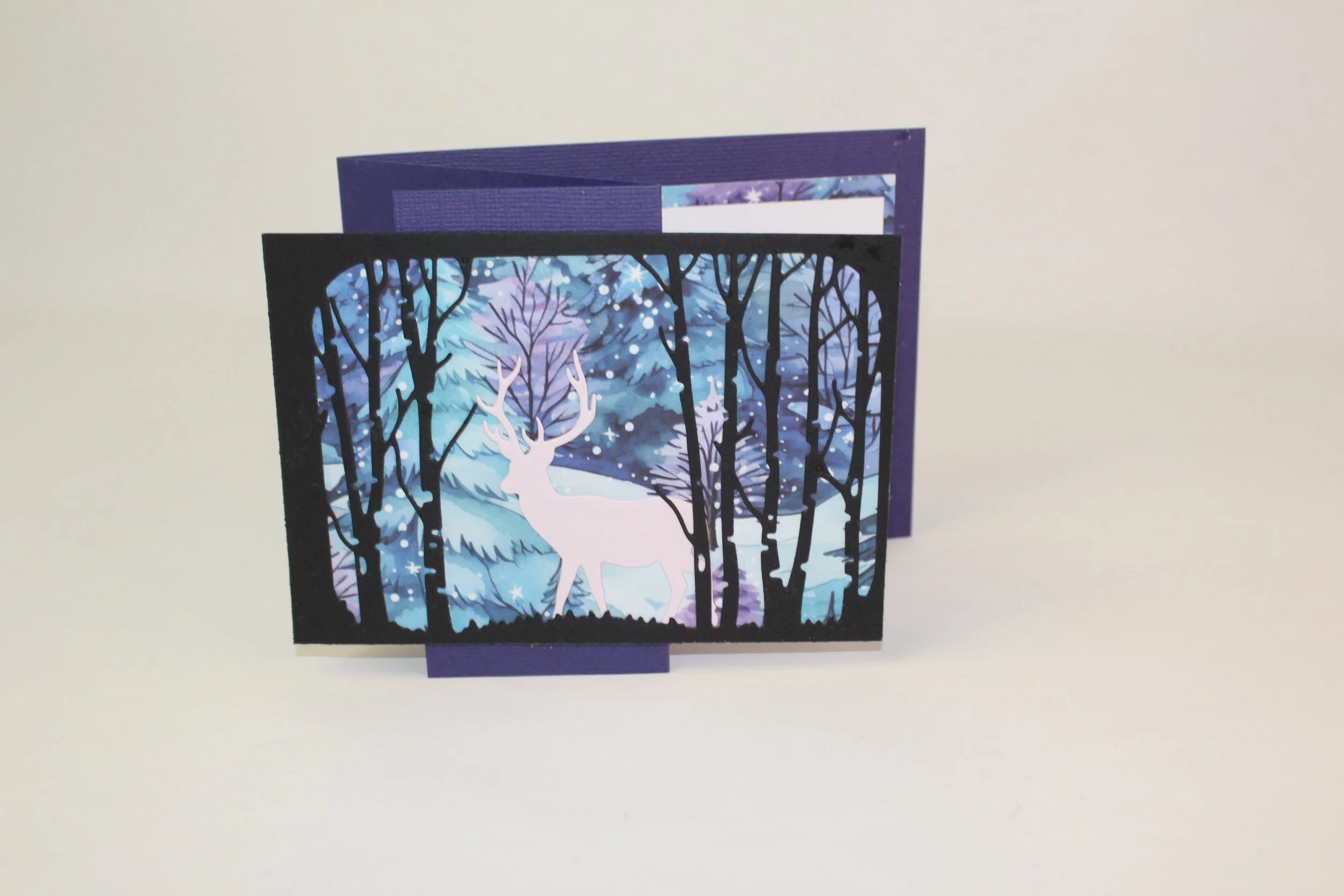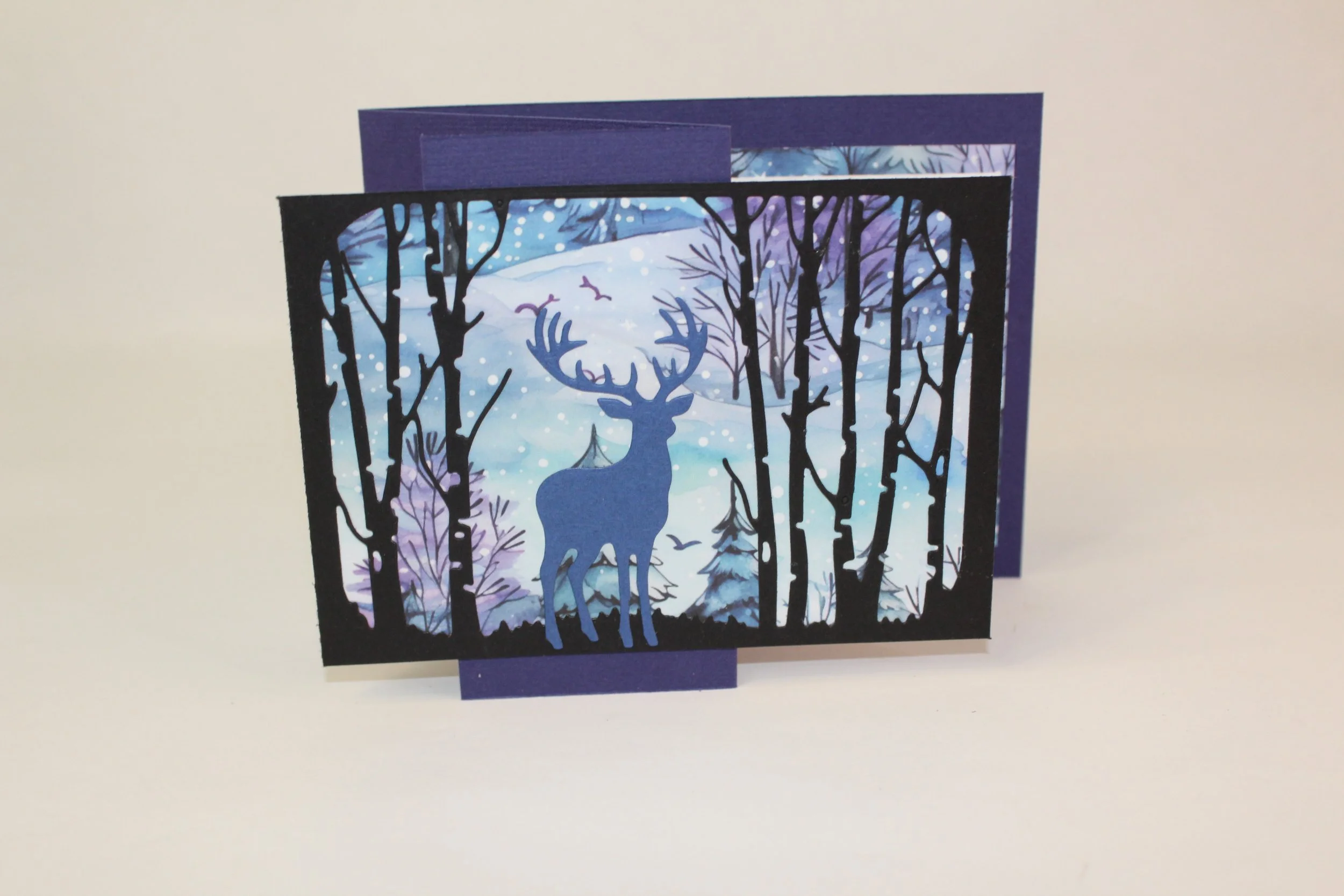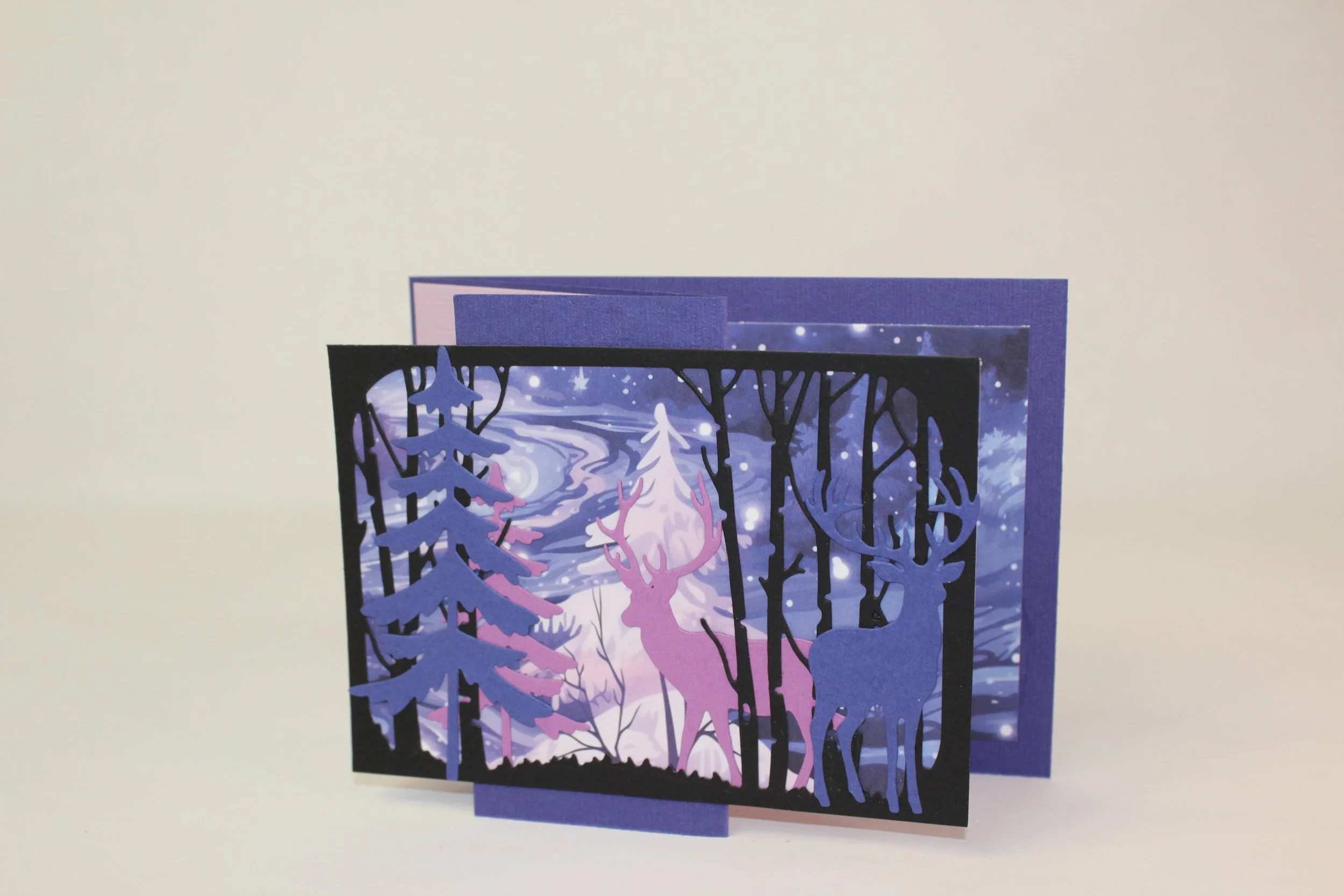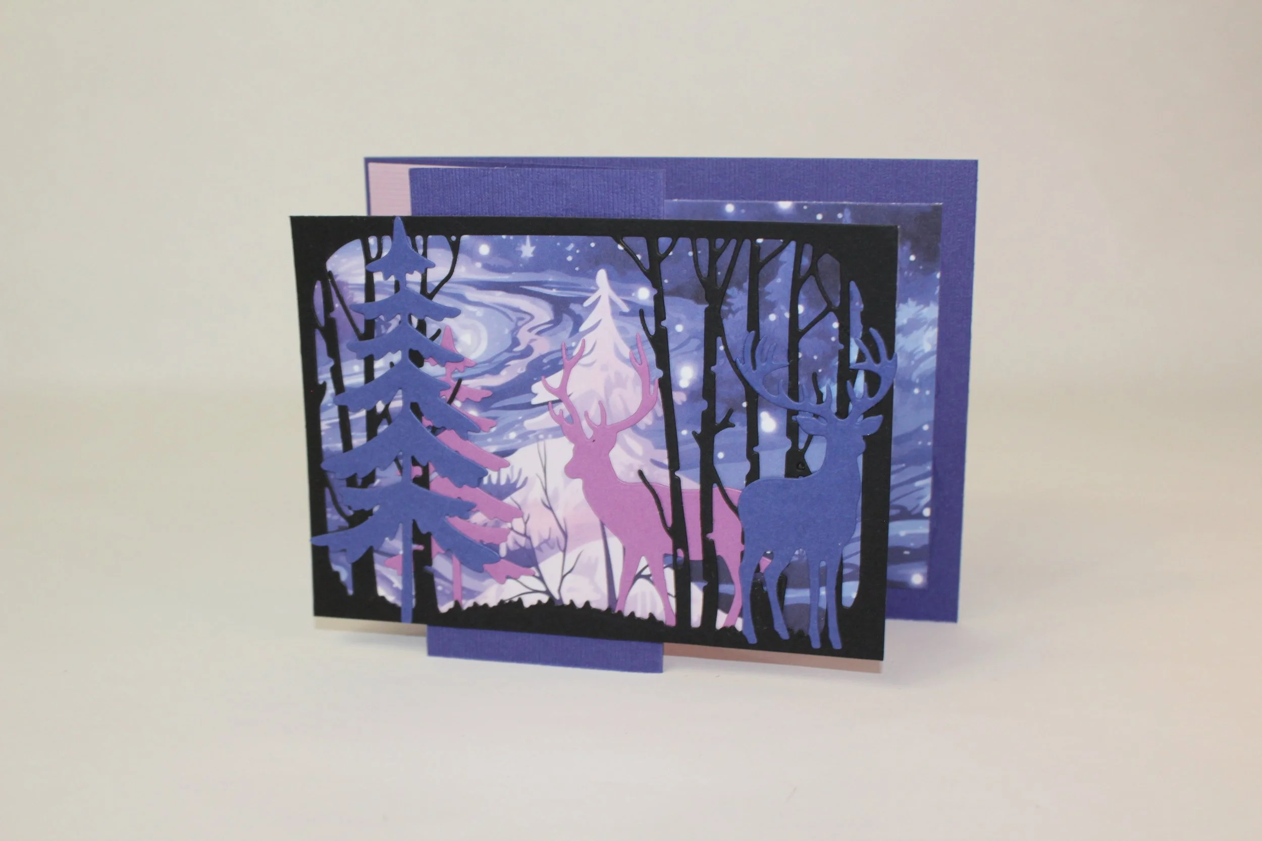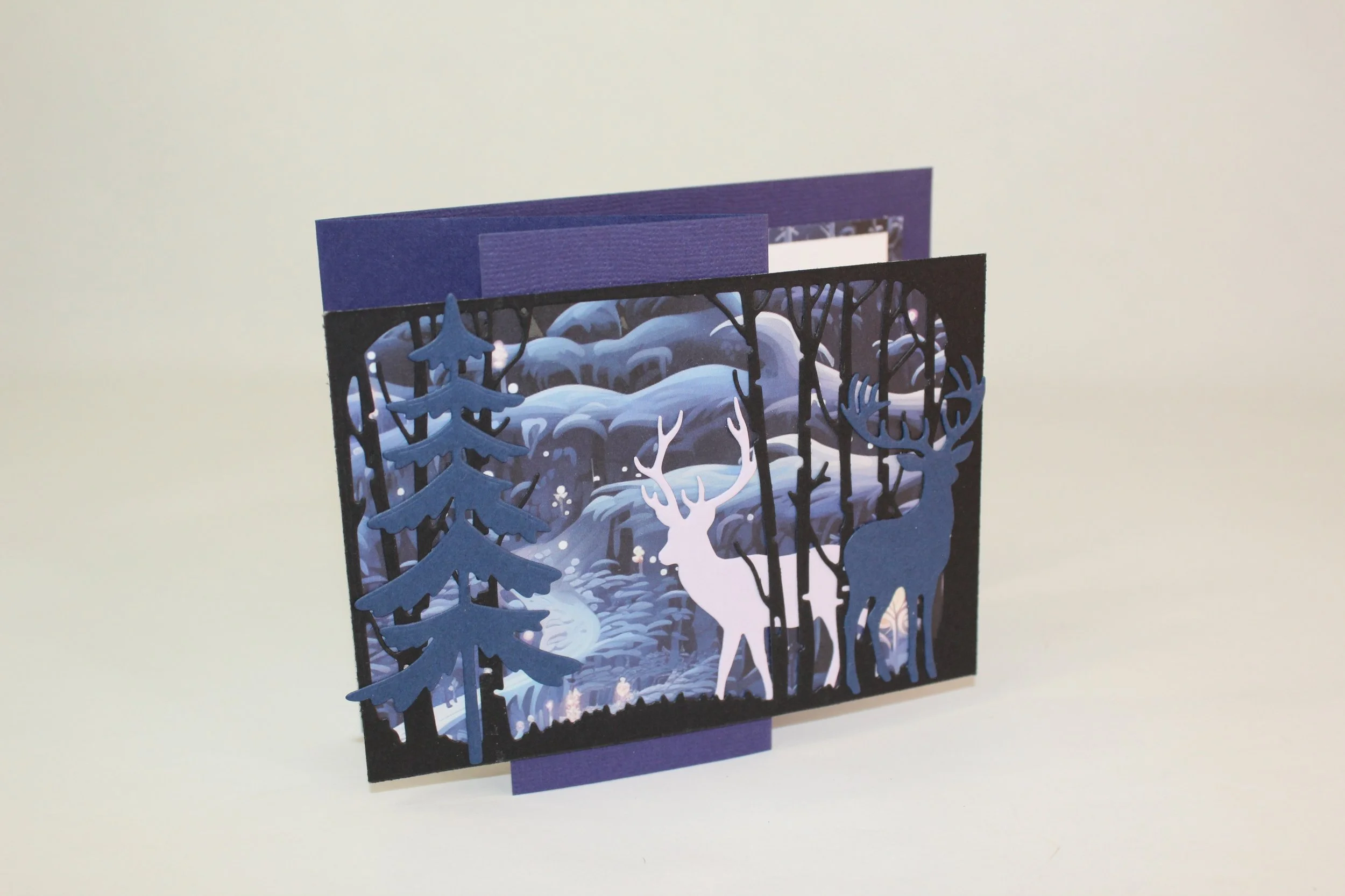 This is a limited edition card that includes die cut deer, trees, and frame making this a unique card with an individual touch. The paper is Winter Wonderland by Stamps by Me. The A2 fun fold card extends to reveal the your handwritten special message and/or sentiment for the recipient. The card is blank on the inside but you can reach out to request a sentiment to be added. Adding a sentiment inside can personalize this card to a birthday, Christmas, or other special occasion card.
