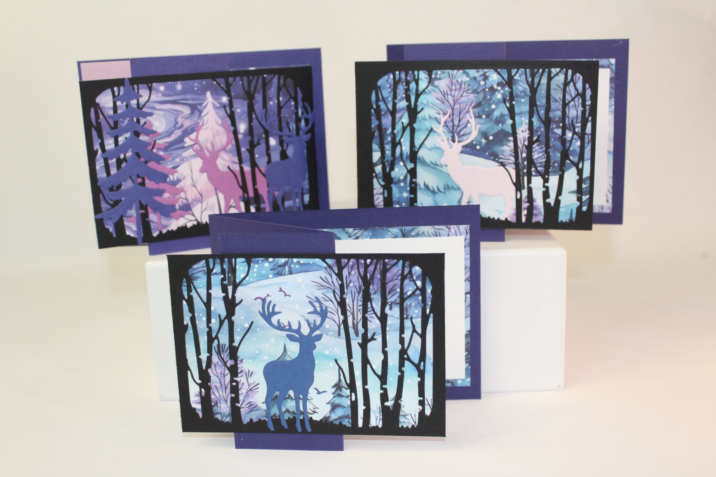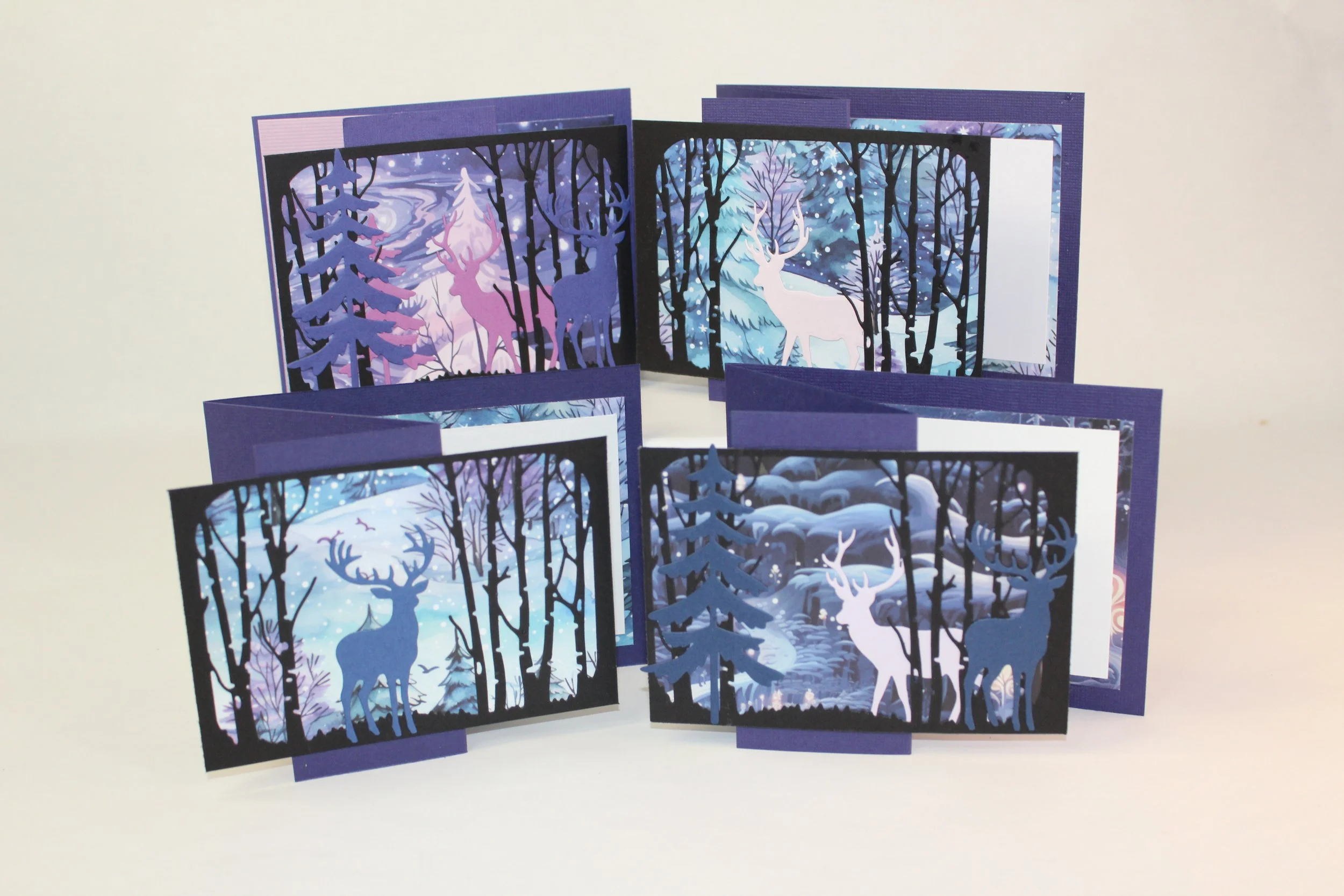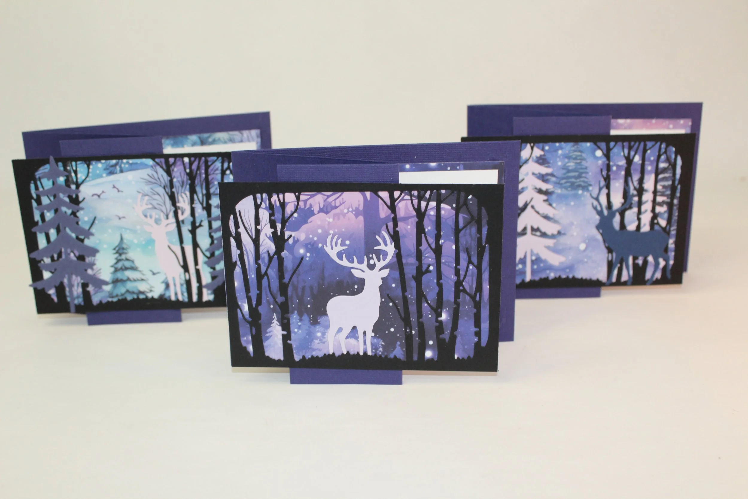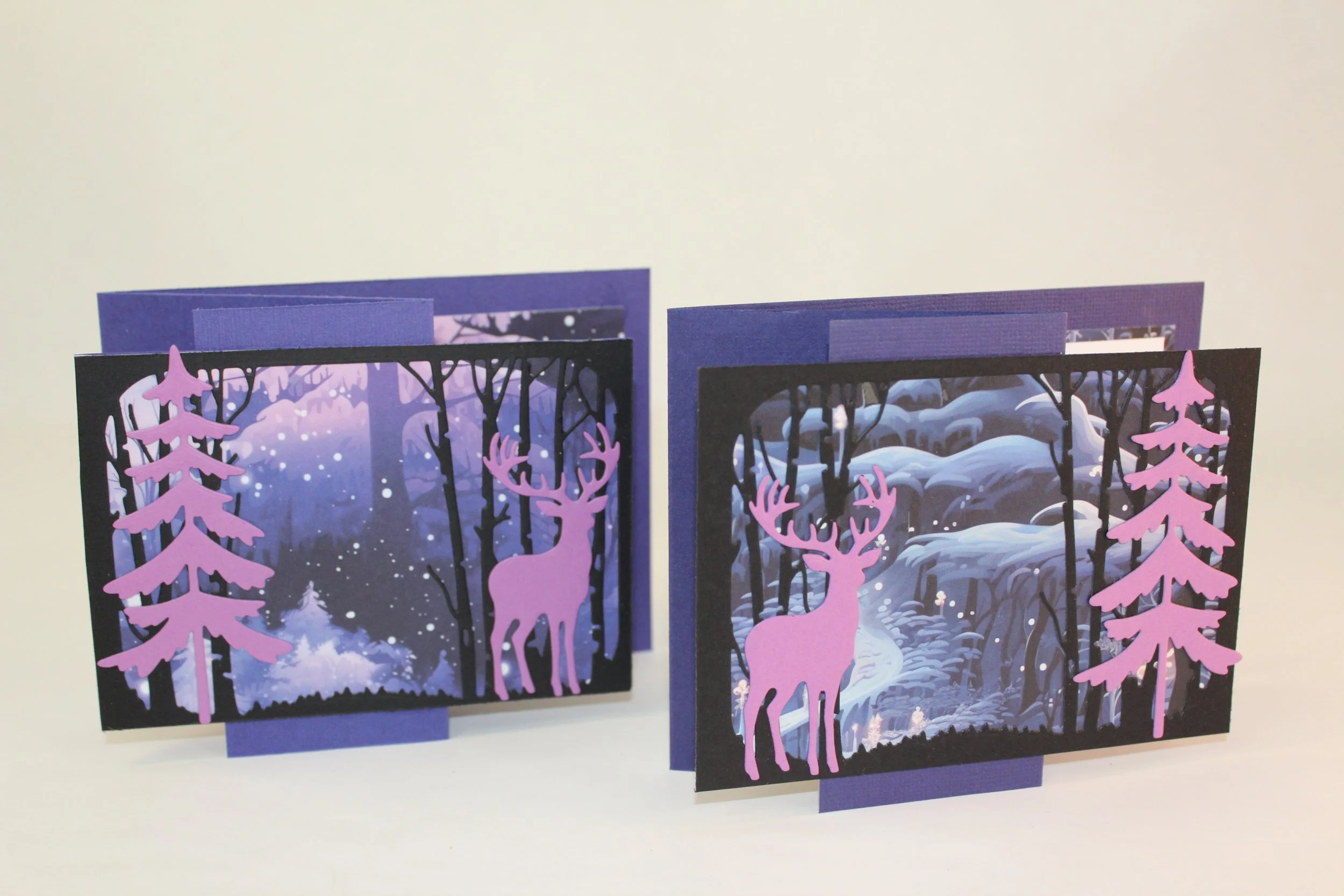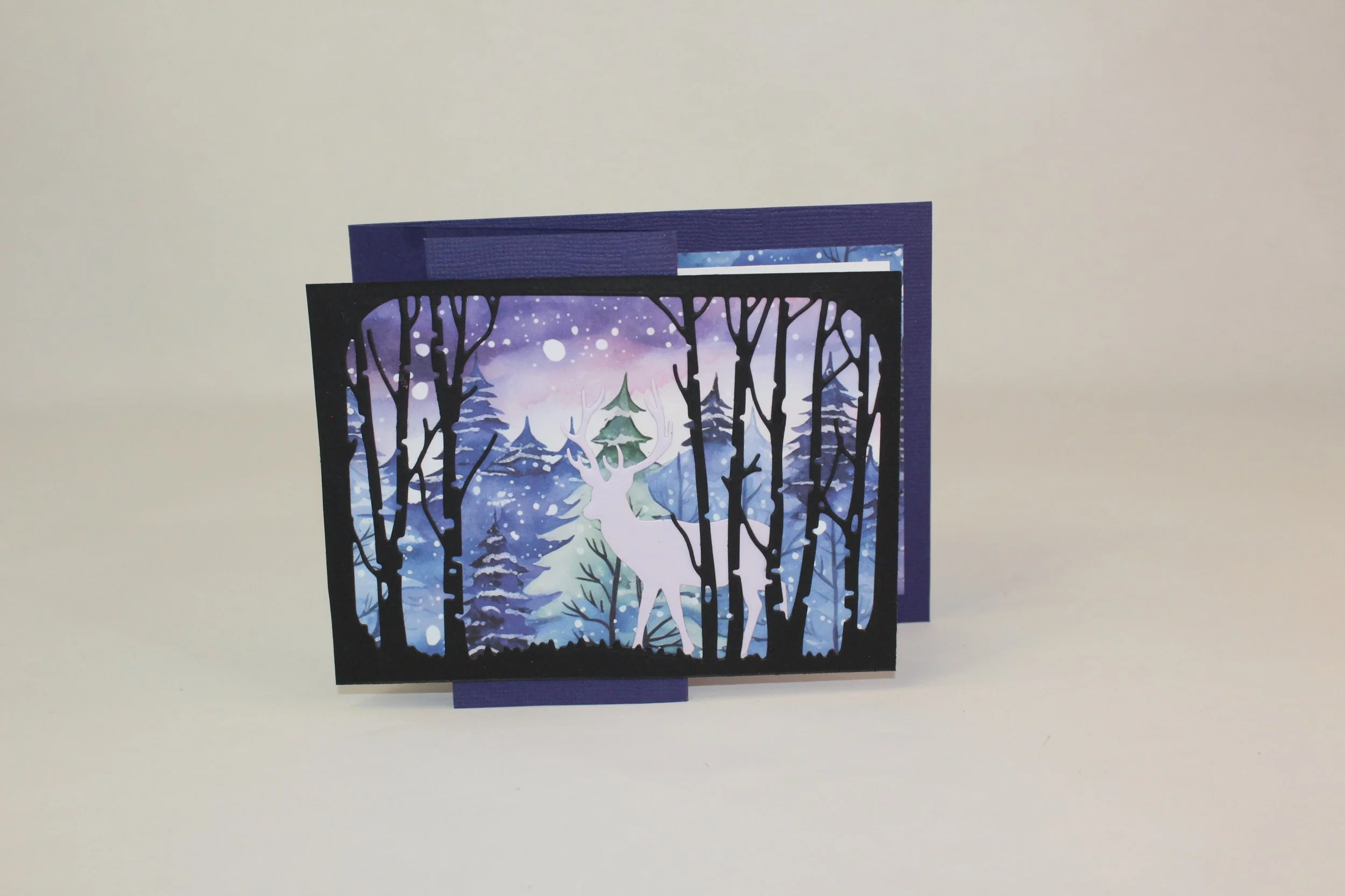 This is a limited edition card that includes die cut deer, trees, and frame making this a unique card with an individual touch. The paper is Winter Wonderland by Stamps by Me. The A2 fun fold card extends to reveal the your handwritten special message and/or sentiment for the recipient. The card is blank on the inside but you can reach out to request a sentiment to be added. Adding a sentiment inside can personalize this card to a birthday, Christmas, or other special occasion card.